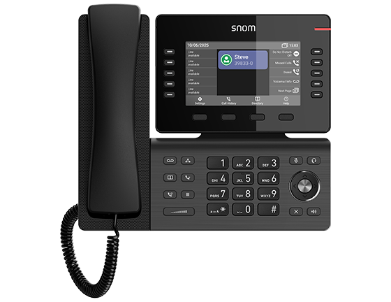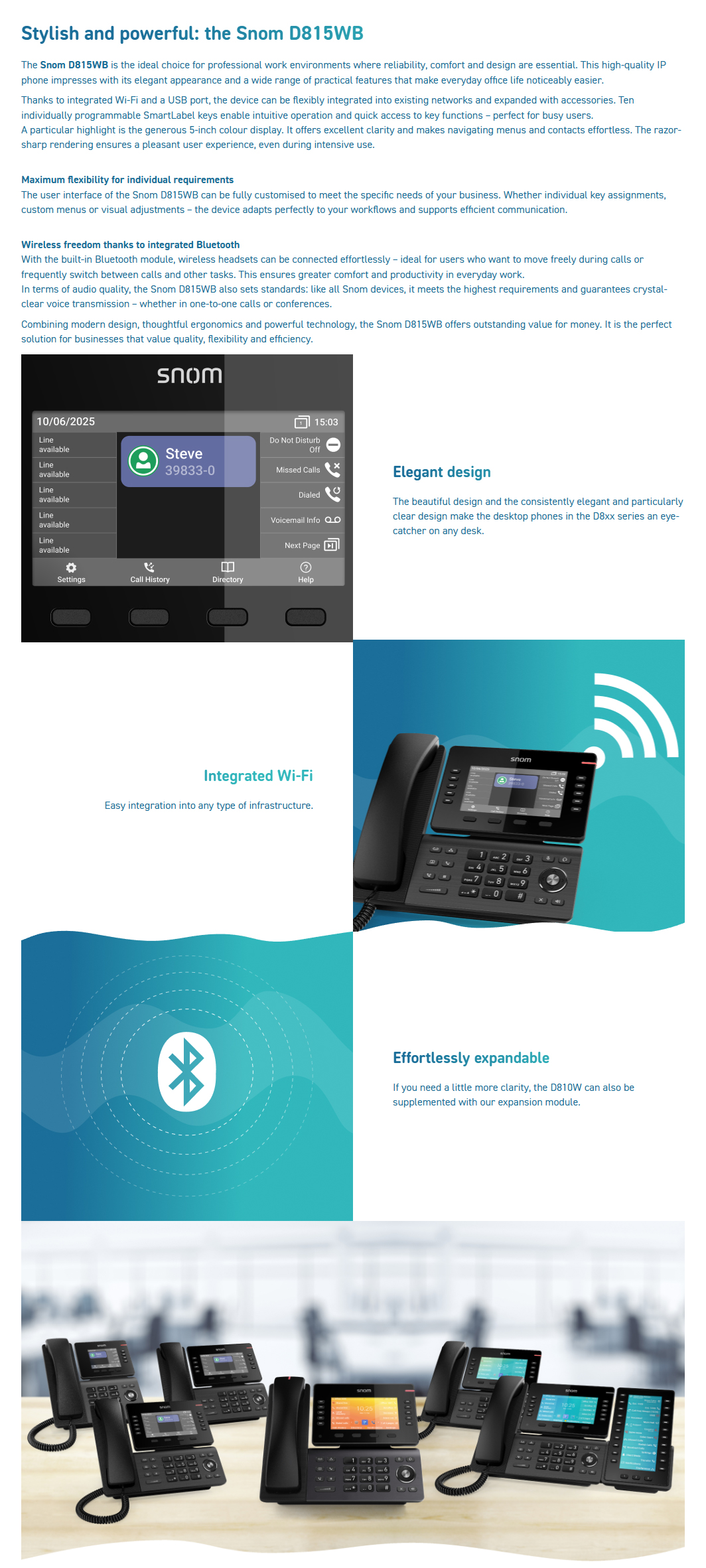 The Snom D815WB is the ideal choice for professional work environments where reliability, comfort and design are essential. This high-quality IP phone impresses with its elegant appearance and a wide range of practical features that make everyday office life noticeably easier. Thanks to integrated Wi-Fi and a USB port, the device can be flexibly integrated into existing networks and expanded with accessories.