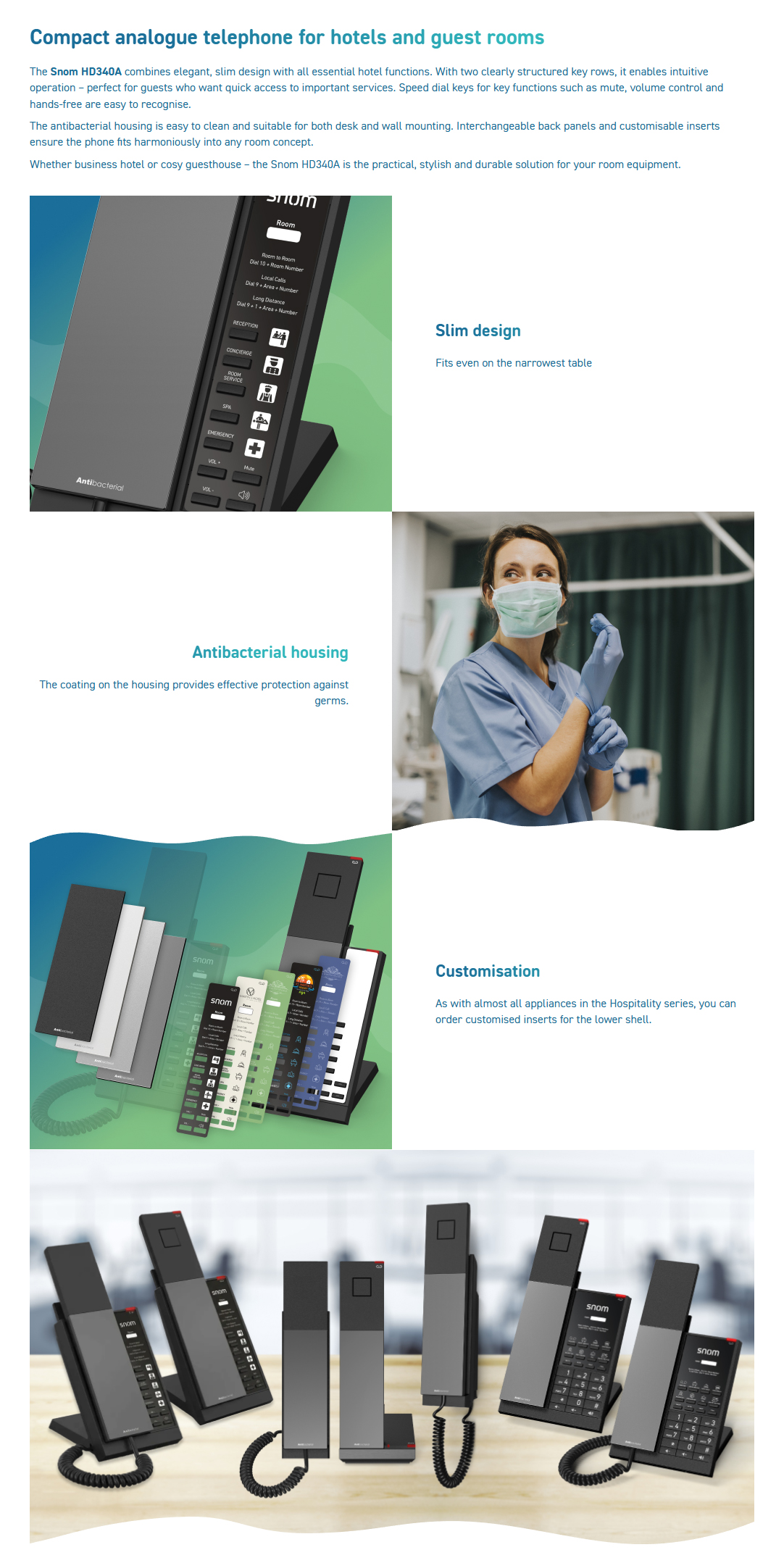 The Snom HD340A combines elegant, slim design with all essential hotel functions. With two clearly structured key rows, it enables intuitive operation – perfect for guests who want quick access to important services. Speed dial keys for key functions such as mute, volume control and hands-free are easy to recognise.