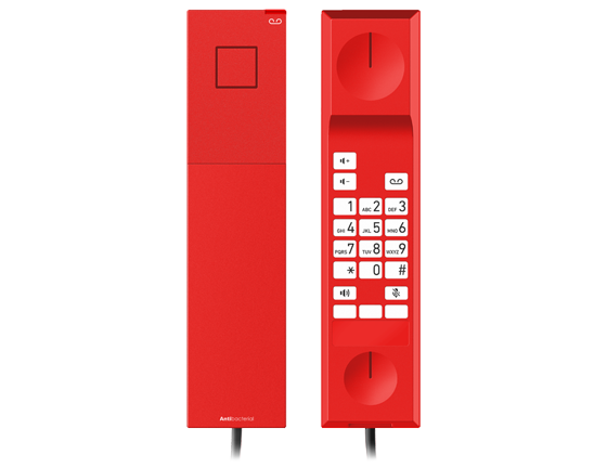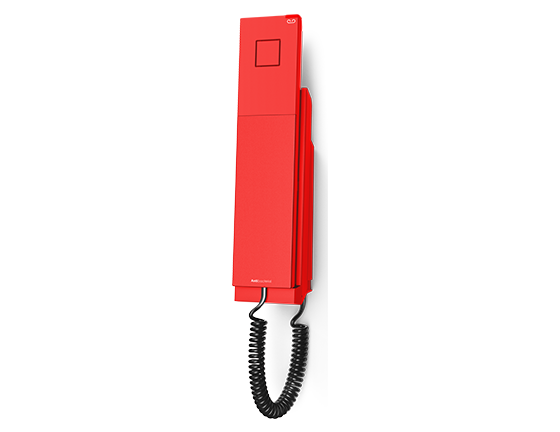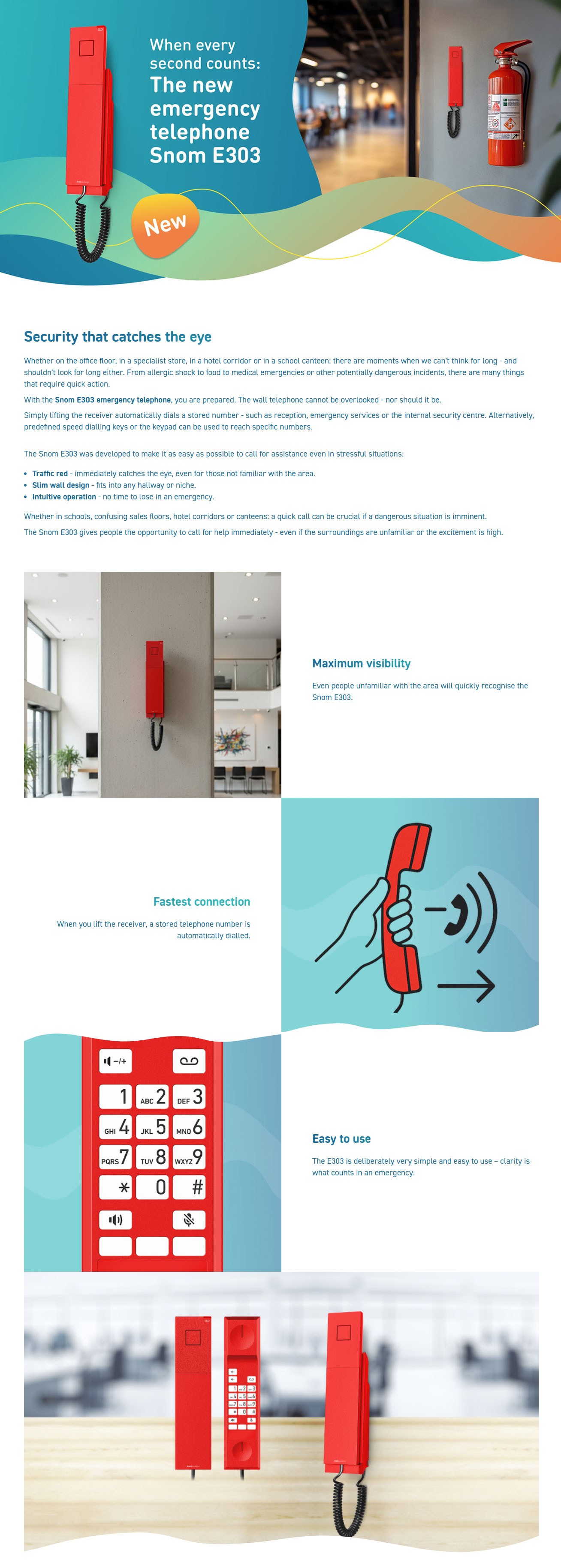 The E303 is a wall-mounted emergency telephone in striking traffic red. It was specifically designed for use in offices, hotel corridors, cafeterias, schools, and similar environments, enabling rapid contact in an emergency.