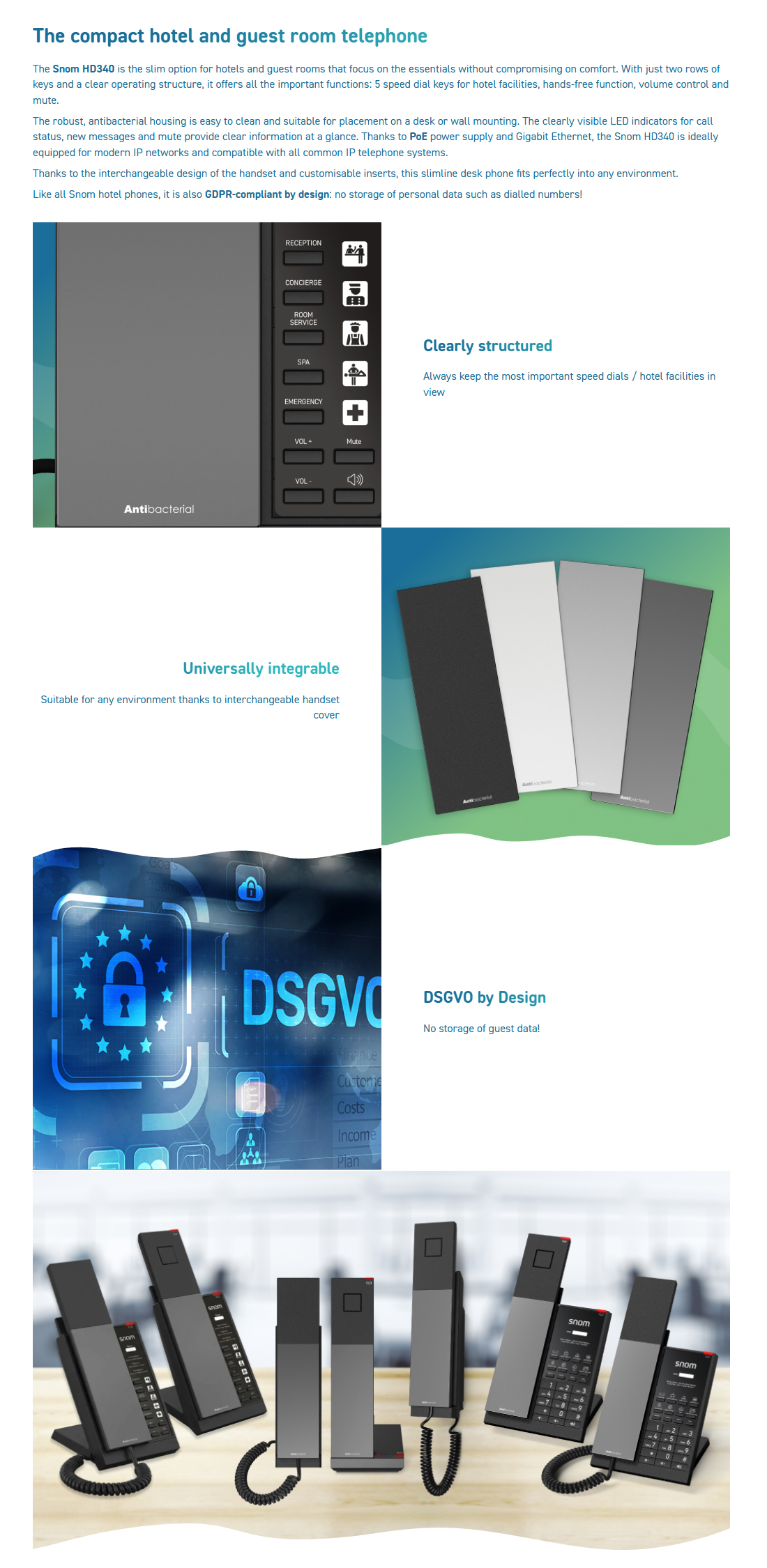The Snom HD340 is the slim option for hotels and guest rooms that focus on the essentials without compromising on comfort. With just two rows of keys and a clear operating structure, it offers all the important functions: 5 speed dial keys for hotel facilities, hands-free function, volume control and mute.