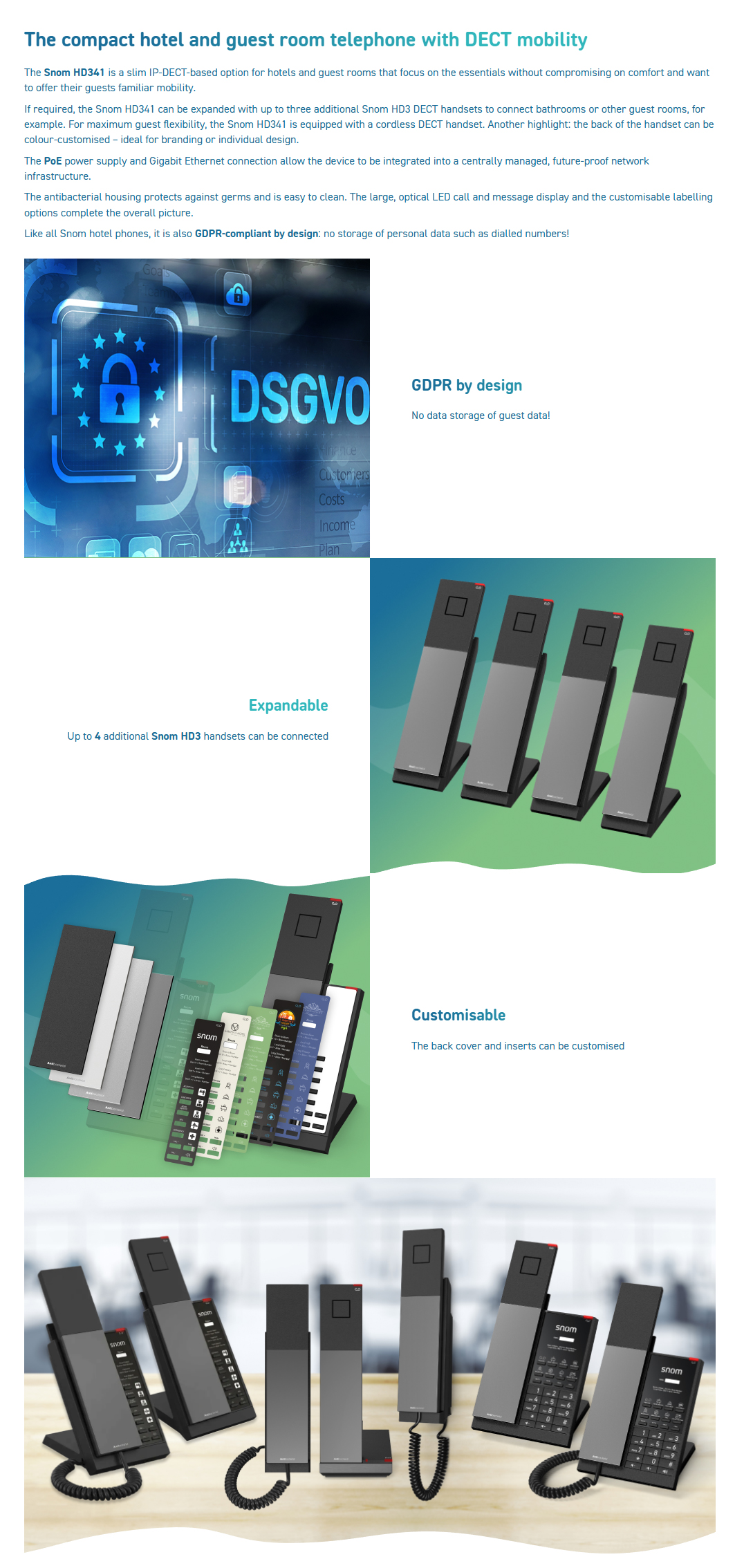The Snom HD341 is a slim IP-Cordless-based option for hotels and guest rooms that focus on the essentials without compromising on comfort and want to offer their guests familiar mobility.