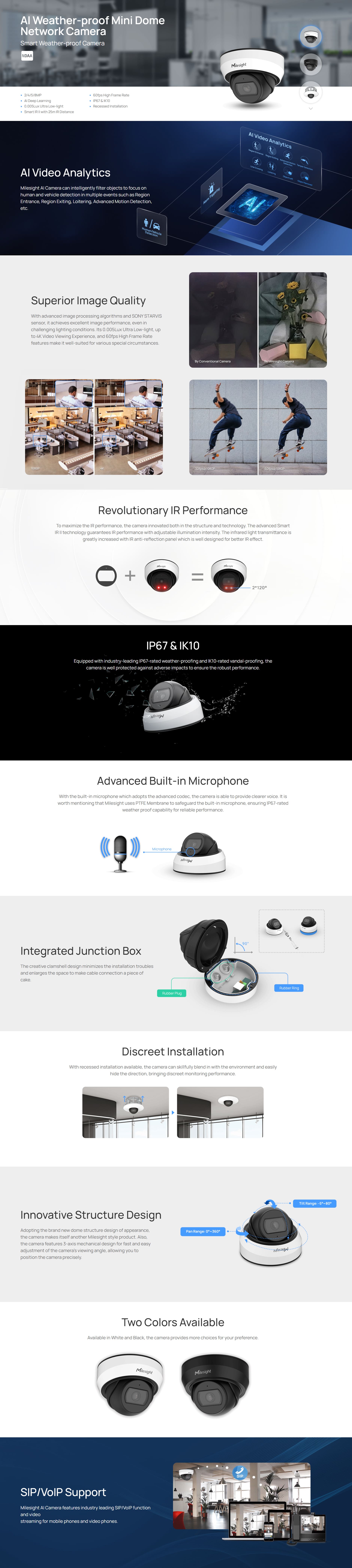 Milesight AI weather-proof mini dome camera features with wide angle lens, IK10 and IP67, which is suitable for indoor and outdoor environments.